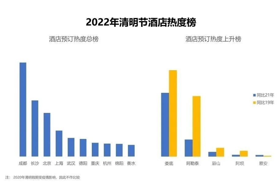 攜程數(shù)智酒店大數(shù)據(jù)出具的《2022年清明節(jié)預測報告》也顯示,2022年清明期間,在全國文旅市場遇冷的情況下,成都、長沙、北京的酒店生意預測相對較好,位居熱度榜單前三。眉山、阿壩、雅安等城市的酒店預訂熱度同比2021年上升明顯。