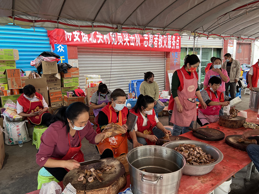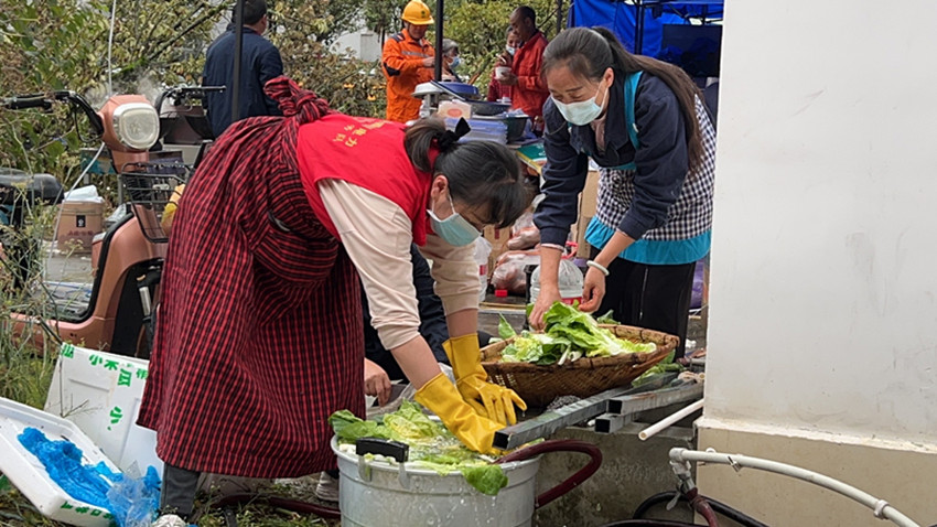 在得妥鎮(zhèn)北頭村的路旁,來自瀘定縣冷磧鎮(zhèn)桐子林村的李星芳和其他志愿者一起忙著切菜煮飯。她告訴記者,地震發(fā)生后,我主動(dòng)報(bào)名加入志愿者團(tuán)隊(duì)?!拔覀冞@個(gè)點(diǎn)上除了政府發(fā)放的物資,還有很多附近村民和好心人送來的菜肉和水果,大家都在用自己的行動(dòng)出一份力?!闭诿χ胁说闹驹刚吆樾l(wèi)群說。就在記者采訪時(shí),在北頭村開飯館的易姝宏一家送來了鹵菜、排骨和新鮮蔬菜,記賬員茍有成忙著清點(diǎn)數(shù)量并記錄在冊?!暗卣鸷?,爸媽把年邁的奶奶送到瀘定縣城孃孃家,我也向單位請了假,今天我們一起趕回來在這里幫忙”。