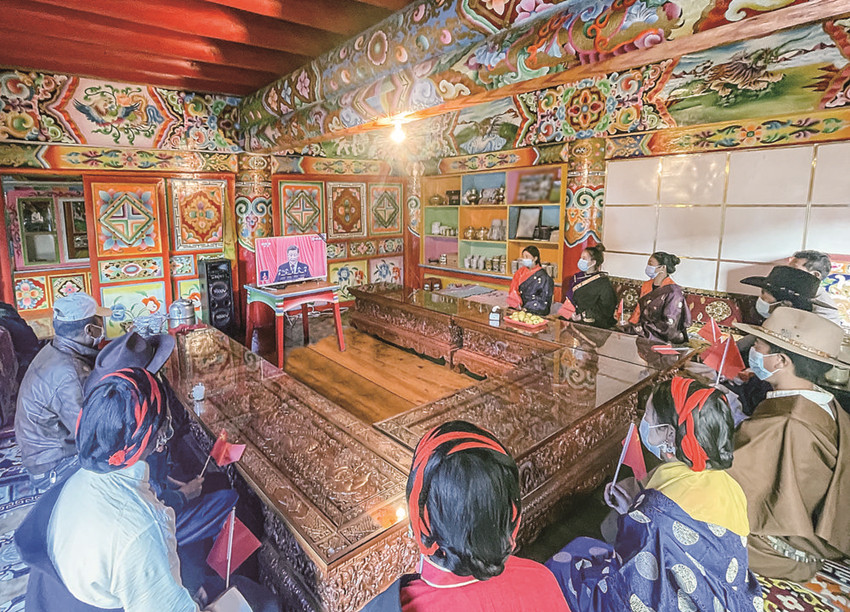 道孚縣麻孜鄉(xiāng)村民集中收看黨的二十大開幕會(huì)。