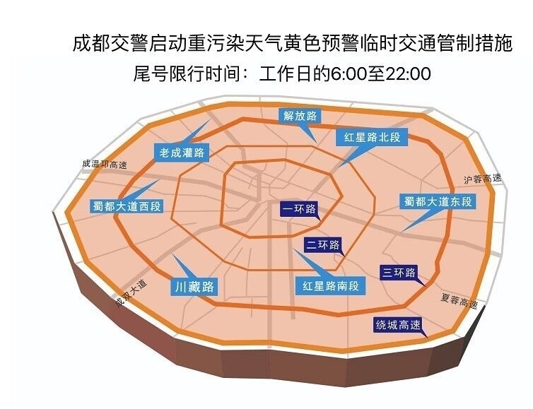 三、工作日的6:00至22:00,在四環(huán)路(成都繞城高速公路G4202,不含)以內區(qū)域道路,實行汽車尾號限行,按照機動車號牌(含臨時號牌汽車)的最后一位阿拉伯數字尾號限行。即:星期一限尾號“1”和“6”,星期二限尾號“2”和“7”;星期三限尾號“3”和“8”;星期四限尾號“4”和“9”;星期五限尾號“5”和“0”。公休日因法定節(jié)假日調休為工作日的,不限行。
