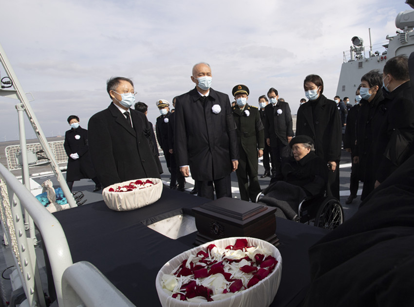 中午12時35分,揚州艦抵達長江入??谒?。在軍艦甲板上,送別的人們,肅立默哀。水天肅穆,波翻浪涌。蔡奇和江澤民同志的夫人王冶坪等親屬,眼含熱淚,強忍悲痛,將江澤民同志的骨灰和繽紛的花瓣一起緩緩撒向無垠的江海。