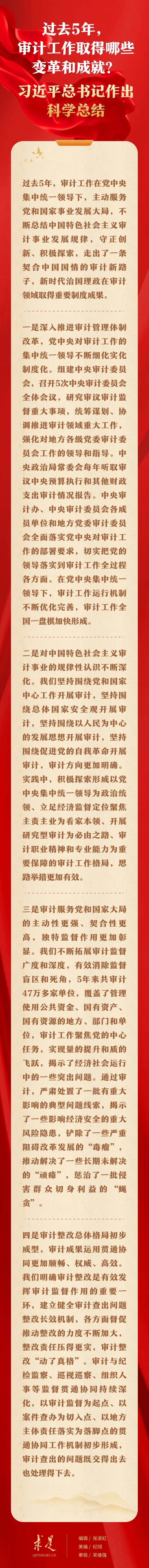 11月1日出版的第21期《求是》雜志刊發(fā)習(xí)近平總書(shū)記重要文章《在二十屆中央審計(jì)委員會(huì)第一次會(huì)議上的講話》。在這篇重要文章中,習(xí)近平總書(shū)記從4個(gè)方面對(duì)過(guò)去5年的審計(jì)工作進(jìn)行科學(xué)總結(jié),強(qiáng)調(diào):“審計(jì)工作取得的這些變革和成就,是新時(shí)代中國(guó)特色社會(huì)主義思想在審計(jì)領(lǐng)域的具體實(shí)踐,彰顯了黨的創(chuàng)新理論的真理力量,具有鮮明的時(shí)代性和實(shí)踐性。要總結(jié)好、運(yùn)用好黨關(guān)于新時(shí)代審計(jì)工作的理論成果和實(shí)踐成果,長(zhǎng)期堅(jiān)持并不斷豐富發(fā)展,指導(dǎo)審計(jì)工作實(shí)現(xiàn)更大作為?!?/p>