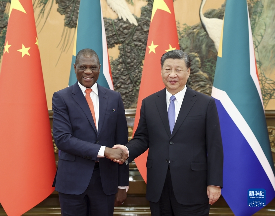 習(xí)近平強調(diào),中方支持南非探索符合本國國情的現(xiàn)代化道路,愿同南非進(jìn)一步夯實政治互信基礎(chǔ),提升互利合作水平。中方愿同南非等非洲國家一道,落實中國支持非洲工業(yè)化、農(nóng)業(yè)現(xiàn)代化、人才培養(yǎng)三項舉措以及高質(zhì)量共建“一帶一路”的八項行動,打造一批高標(biāo)準(zhǔn)、惠民生、可持續(xù)的合作項目,提升中非合作的戰(zhàn)略性和可持續(xù)性,推動構(gòu)建高水平中非命運共同體。雙方應(yīng)繼續(xù)密切在金磚國家機制內(nèi)合作,加強發(fā)展中國家團(tuán)結(jié)合作,推動全球治理體系朝著有利于發(fā)展中國家的方向發(fā)展。