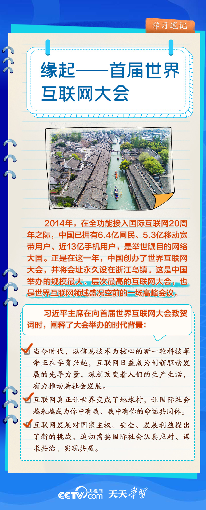 前九屆世界互聯(lián)網(wǎng)大會,習近平主席或親臨現(xiàn)場發(fā)表主旨演講,或視頻致辭,或向大會發(fā)來賀信,以不同形式關(guān)心大會舉辦。央視網(wǎng)《天天學習》欄目推出學習筆記,與您一起了解世界互聯(lián)網(wǎng)大會的十年“網(wǎng)”事。