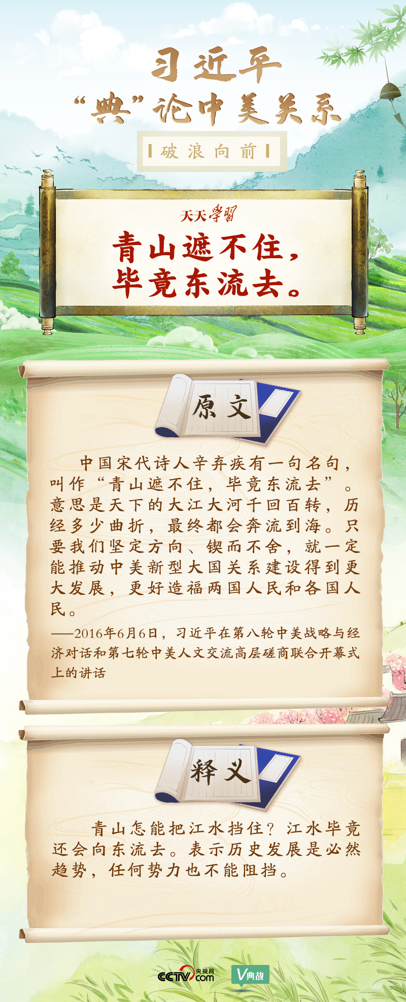 黨的十八大以來,習(xí)近平主席就中美關(guān)系發(fā)表了一系列重要講話。他站在時(shí)代高度分析、研判中美關(guān)系現(xiàn)狀及發(fā)展趨勢,并引經(jīng)據(jù)典為發(fā)展中美關(guān)系指出正確方向。這些論述蘊(yùn)含深刻的戰(zhàn)略思維和政治智慧,具有重大現(xiàn)實(shí)意義和深遠(yuǎn)歷史意義。央視網(wǎng)《天天學(xué)習(xí)》與您一起深刻領(lǐng)會。