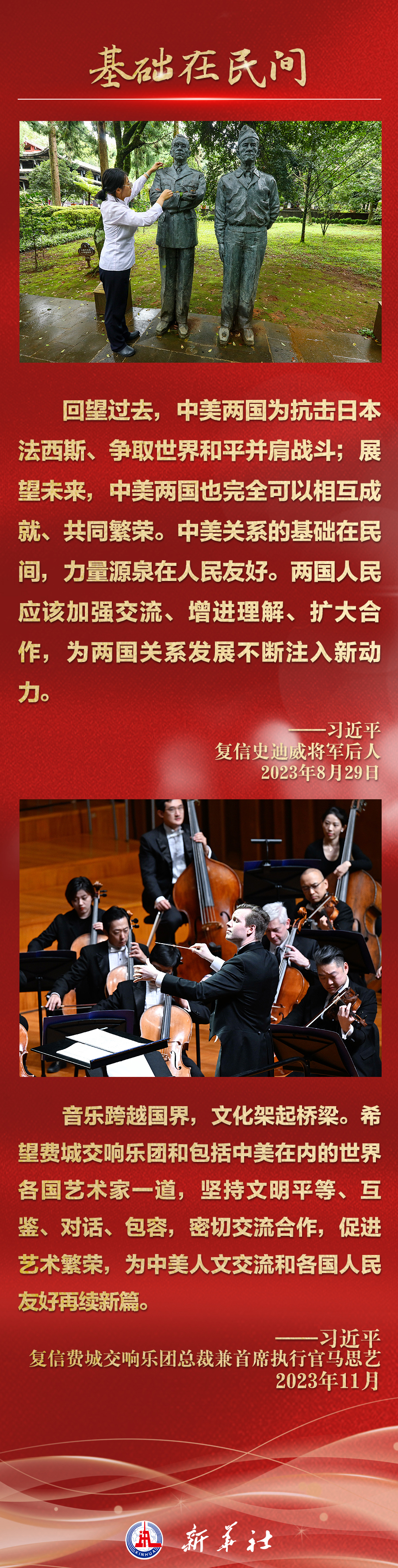 今年以來,從在京會(huì)見美國各界人士,到向“鼓嶺緣”中美民間友好論壇等活動(dòng)致賀信,再到復(fù)信美國華盛頓州“美中青少年學(xué)生交流協(xié)會(huì)”、史迪威將軍后人、飛虎隊(duì)老兵等友好人士,習(xí)近平主席同美國各界真摯互動(dòng),強(qiáng)調(diào)中美關(guān)系基礎(chǔ)在民間,希望在人民,未來在青年,活力在地方。
