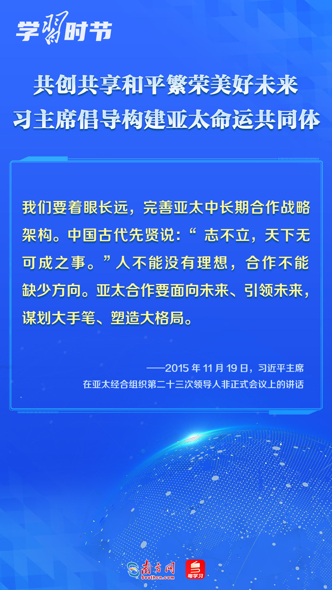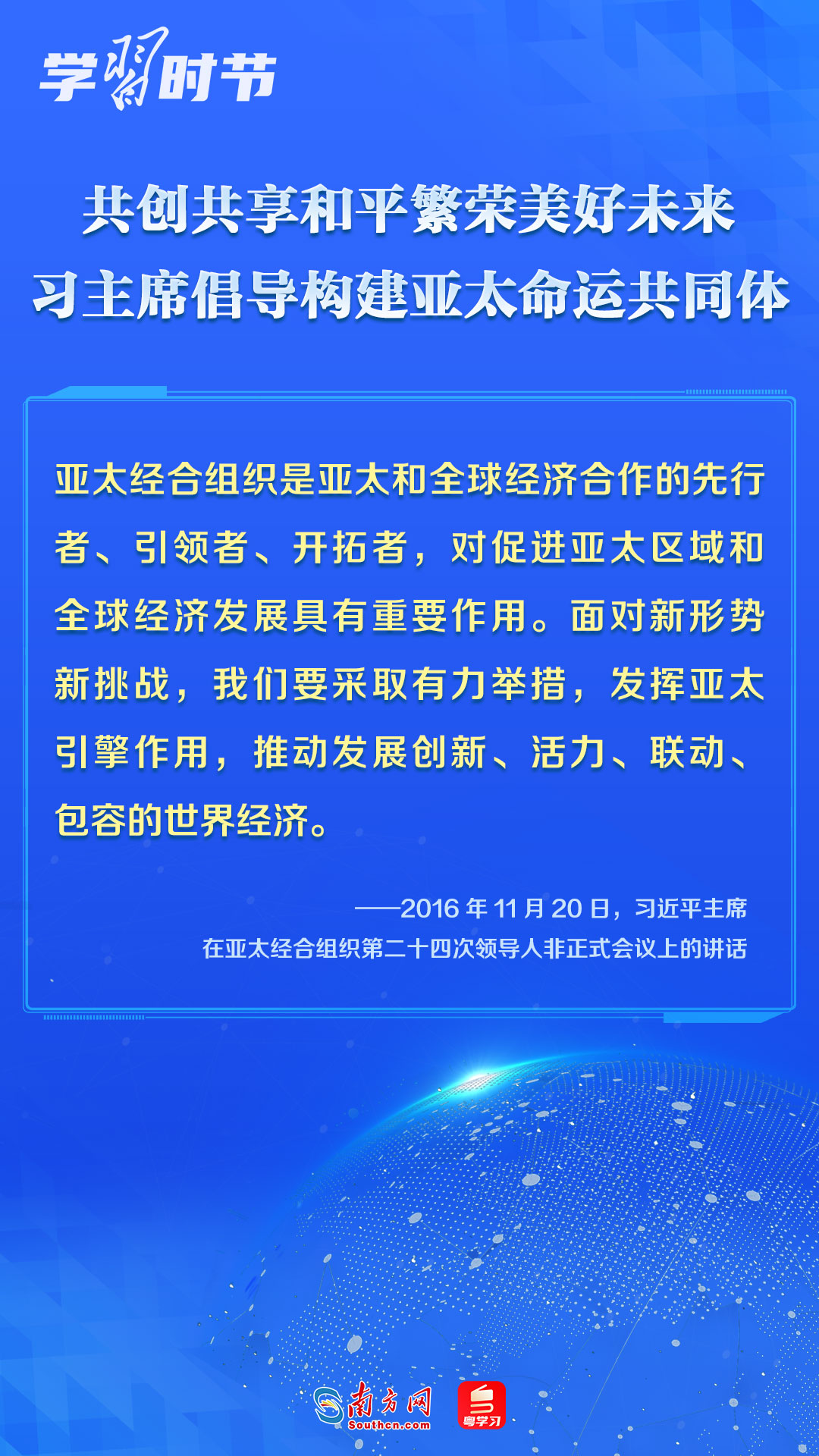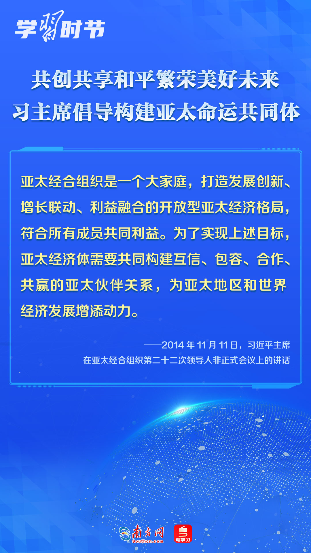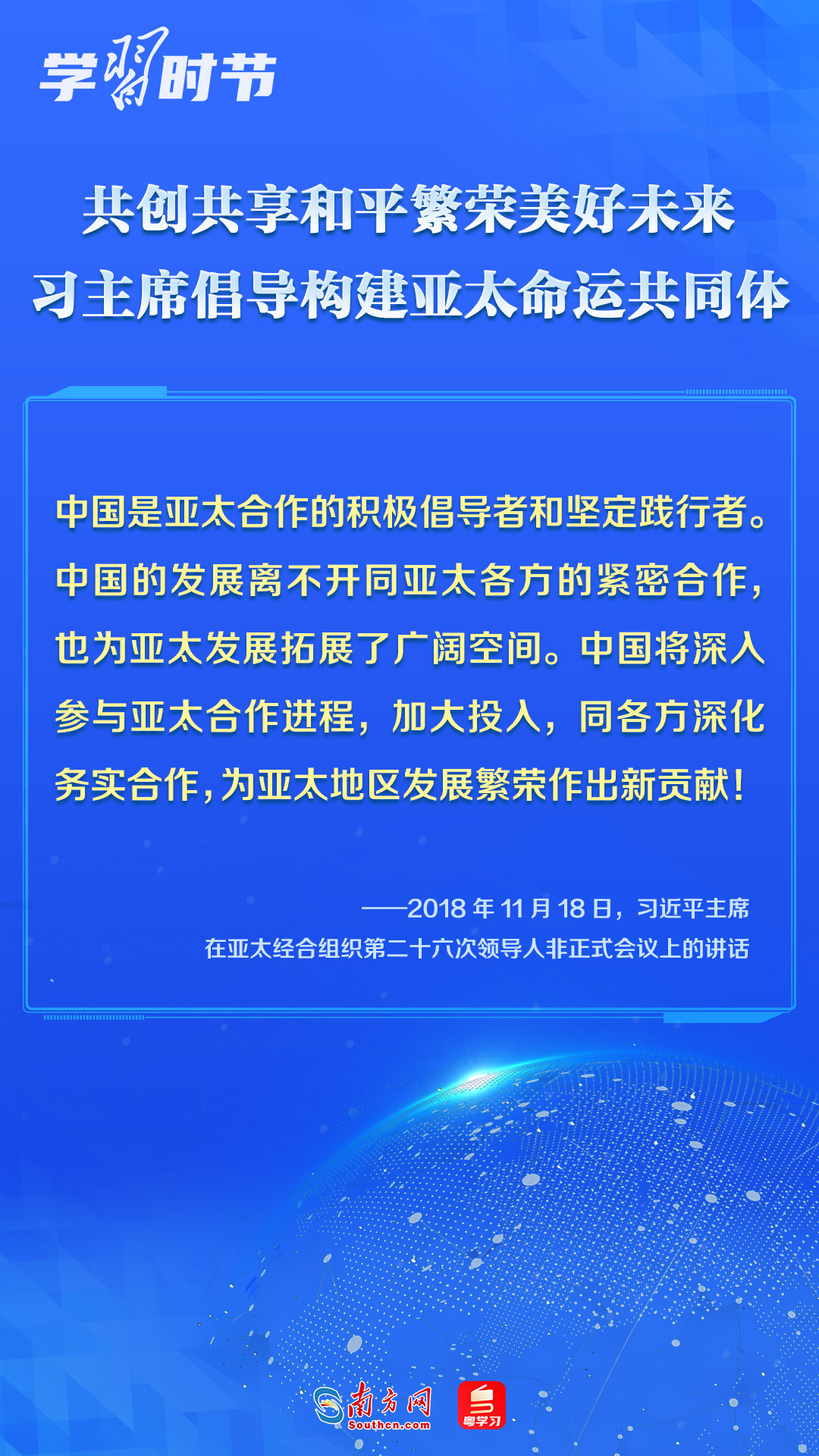 中國一直是APEC的積極參與者、貢獻(xiàn)者,為推動(dòng)建設(shè)亞太大家庭發(fā)揮了重要作用。習(xí)近平主席多次出席APEC會(huì)議,以中國主張促進(jìn)亞太合作,以中國貢獻(xiàn)推動(dòng)亞太發(fā)展,以中國智慧凝聚亞太共識,多次闡述構(gòu)建開放包容、創(chuàng)新增長、互聯(lián)互通、合作共贏的亞太命運(yùn)共同體的理念主張和重大意義,讓我們一同學(xué)習(xí)。