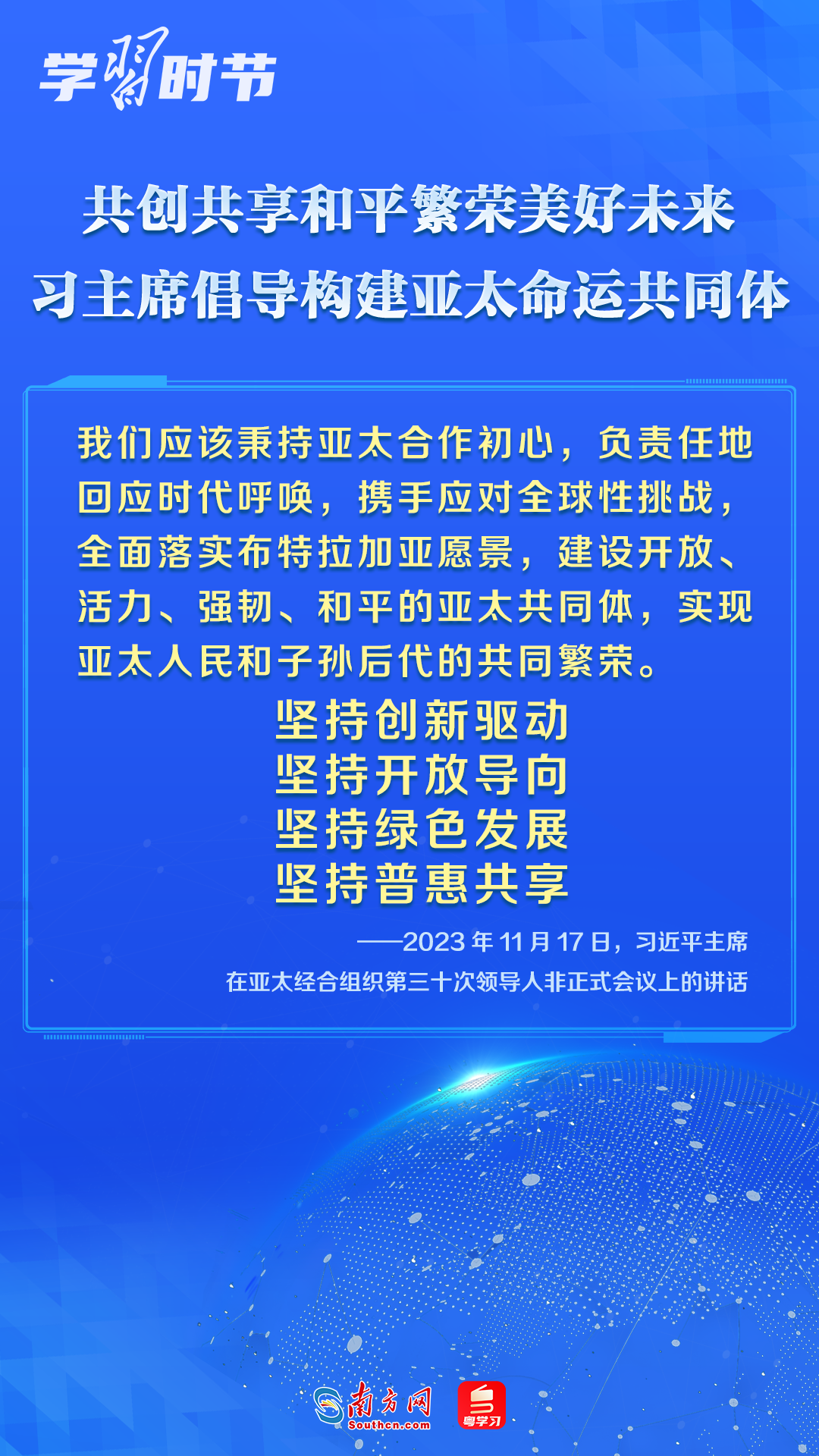 實(shí)現(xiàn)亞太更大發(fā)展,需要每個(gè)成員腳踏實(shí)地拿出行動(dòng)。中國(guó)給出了自己的具體方案:堅(jiān)持創(chuàng)新驅(qū)動(dòng)發(fā)展戰(zhàn)略,更好為亞太發(fā)展賦能;堅(jiān)持高水平實(shí)施《區(qū)域全面經(jīng)濟(jì)伙伴關(guān)系協(xié)定》,主動(dòng)對(duì)接《全面與進(jìn)步跨太平洋伙伴關(guān)系協(xié)定》和《數(shù)字經(jīng)濟(jì)伙伴關(guān)系協(xié)定》高標(biāo)準(zhǔn)經(jīng)貿(mào)規(guī)則,積極推動(dòng)加入兩個(gè)協(xié)定進(jìn)程,同各方共繪開放發(fā)展新圖景;堅(jiān)持走生態(tài)優(yōu)先、綠色發(fā)展之路,推動(dòng)共建清潔美麗的亞太;繼續(xù)支持亞太經(jīng)合組織開展經(jīng)濟(jì)技術(shù)合作,共同做大亞太發(fā)展蛋糕。