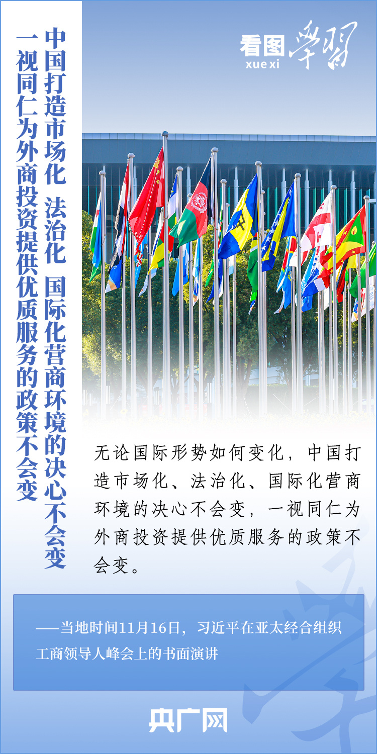 當(dāng)?shù)貢r間11月16日,國家主席習(xí)近平應(yīng)邀出席亞太經(jīng)合組織工商領(lǐng)導(dǎo)人峰會并發(fā)表書面演講。習(xí)主席深刻總結(jié)了亞太經(jīng)濟合作30年來非凡成就和啟示,對亞太合作下一個30年將走向何方這一新的時代之問提出中國答案,重申“中國打造市場化、法治化、國際化營商環(huán)境的決心不會變,一視同仁為外商投資提供優(yōu)質(zhì)服務(wù)的政策不會變”,向全球工商界發(fā)出邀請,歡迎“積極參與中國式現(xiàn)代化進(jìn)程,共享中國高質(zhì)量發(fā)展帶來的巨大機遇!”一起來學(xué)習(xí)。
