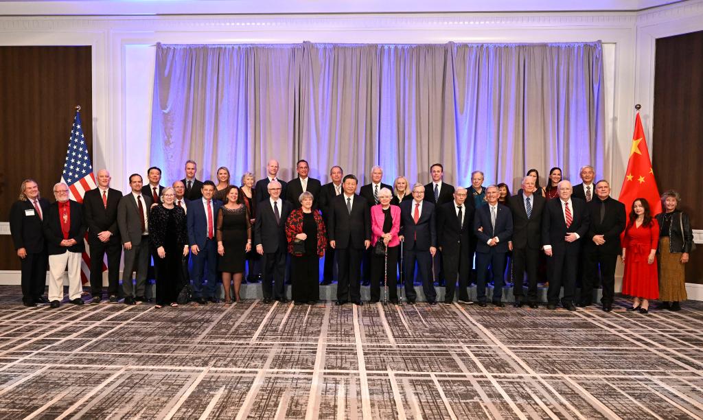 當(dāng)?shù)貢r(shí)間11月15日晚,國家主席習(xí)近平在美國舊金山出席美國友好團(tuán)體聯(lián)合舉行的歡迎宴會(huì)。這是宴會(huì)開始前,習(xí)近平會(huì)見飛虎隊(duì)和史迪威將軍后人、鼓嶺、艾奧瓦州、華盛頓州等方面友好人士代表,同他們親切交談并合影留念。