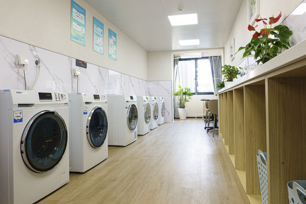 閔行區(qū)新時(shí)代城市建設(shè)者管理者之家的共享廚房和共享洗衣房。