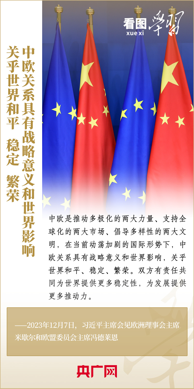 12月7日,國(guó)家主席習(xí)近平會(huì)見來華舉行第二十四次中國(guó)—?dú)W盟領(lǐng)導(dǎo)人會(huì)晤的歐洲理事會(huì)主席米歇爾和歐盟委員會(huì)主席馮德萊恩,雙方就事關(guān)中歐關(guān)系的戰(zhàn)略性問題,以及中歐各領(lǐng)域?qū)υ捄献?、雙方重點(diǎn)關(guān)切、全球治理、國(guó)際和地區(qū)熱點(diǎn)問題等深入坦誠(chéng)交換看法,并就一系列問題達(dá)成重要共識(shí)。今年是中歐建立全面戰(zhàn)略伙伴關(guān)系20周年,習(xí)主席強(qiáng)調(diào),中歐關(guān)系具有戰(zhàn)略意義和世界影響,關(guān)乎世界和平、穩(wěn)定、繁榮。一起來學(xué)習(xí)!