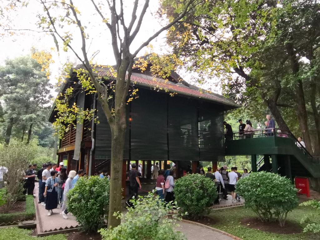 在河內(nèi)地標(biāo)巴亭廣場一側(cè),坐落著胡志明陵和胡志明故居。記者抵達(dá)廣場時,守衛(wèi)胡志明陵的儀仗兵正在舉行換崗儀式,眾多民眾和游客高舉相機(jī)或手機(jī),記錄下這莊嚴(yán)肅穆的一刻。胡志明陵北側(cè)的胡志明故居內(nèi),各國游客排起長隊,在他曾長期居住和工作的高腳屋下駐足留影。