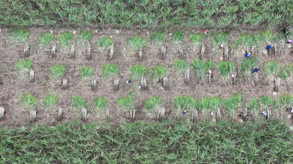 近日,無人機(jī)拍攝的廣西來賓市興賓區(qū)蔗農(nóng)正在砍收甘蔗。 新華社記者 周華 攝