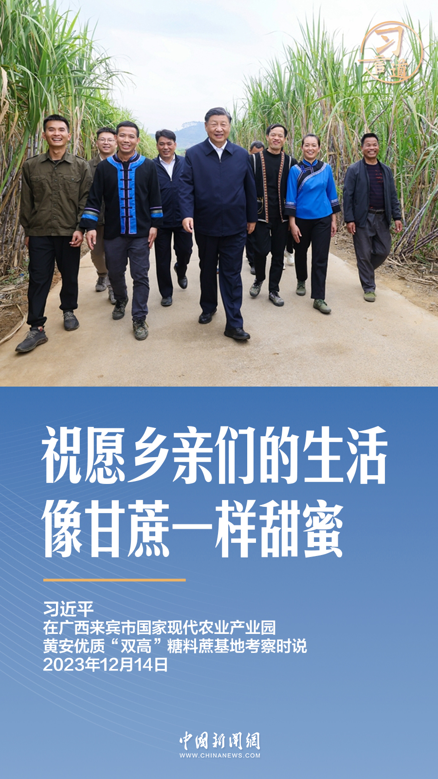 12月14日,在廣西來賓的甘蔗林里,習(xí)近平向蔗農(nóng)送上祝福:祝愿鄉(xiāng)親們的生活像甘蔗一樣甜蜜。