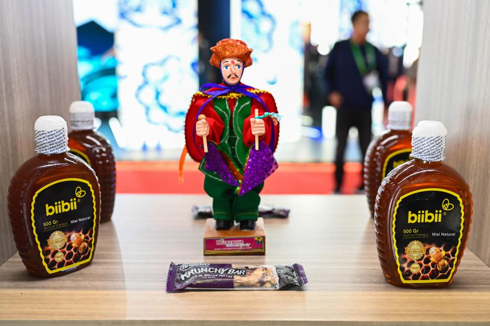2023年11月8日在第六屆進(jìn)博會上拍攝的尼加拉瓜蜂蜜產(chǎn)品。