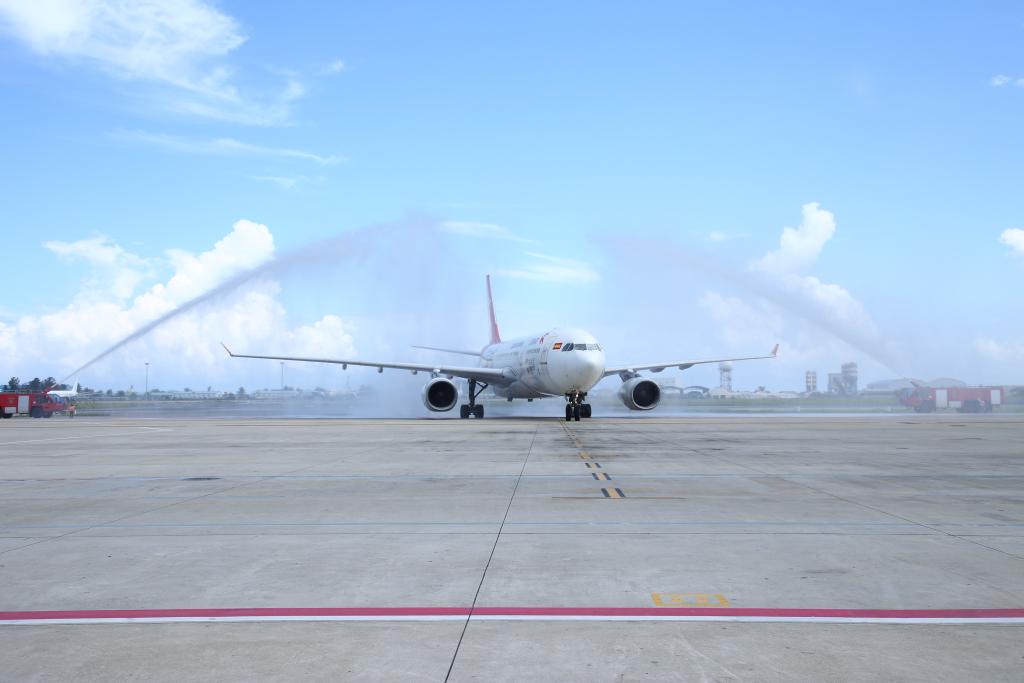 ??2023年1月18日,中國(guó)首都航空J(rèn)D455航班在馬爾代夫馬累維拉納國(guó)際機(jī)場(chǎng)接受水門(mén)禮。