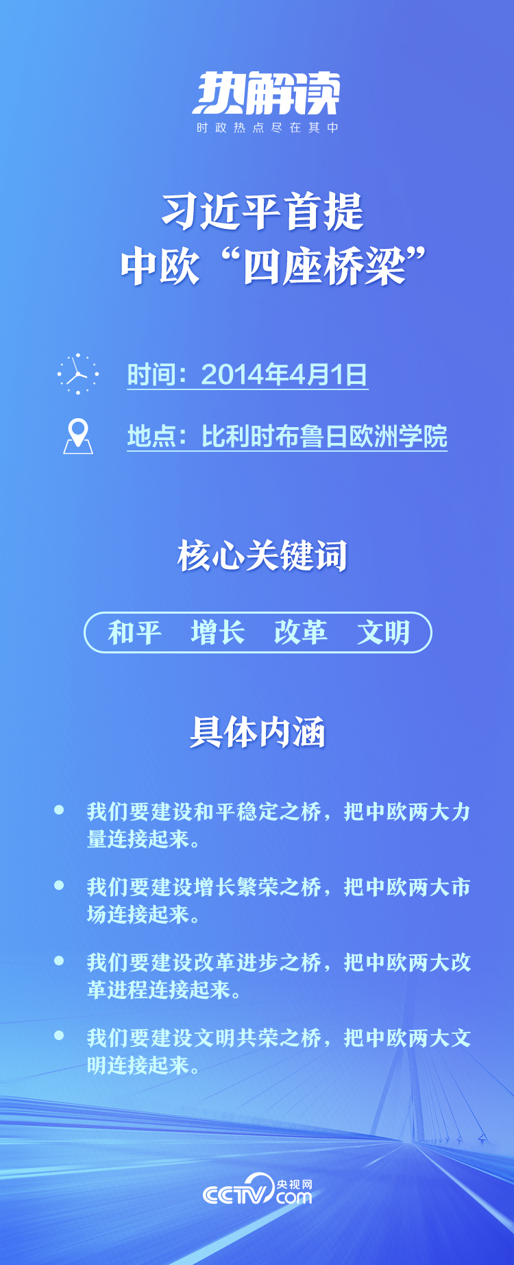 2014年,在位于比利時(shí)有著“歐洲政治家的搖籃”之稱的布魯日歐洲學(xué)院,習(xí)主席發(fā)表重要演講。他借用“布魯日”在弗拉芒語中“橋”的含義,全面闡述中國對(duì)歐政策,首次提出中歐要建設(shè)“四座橋梁”主張: