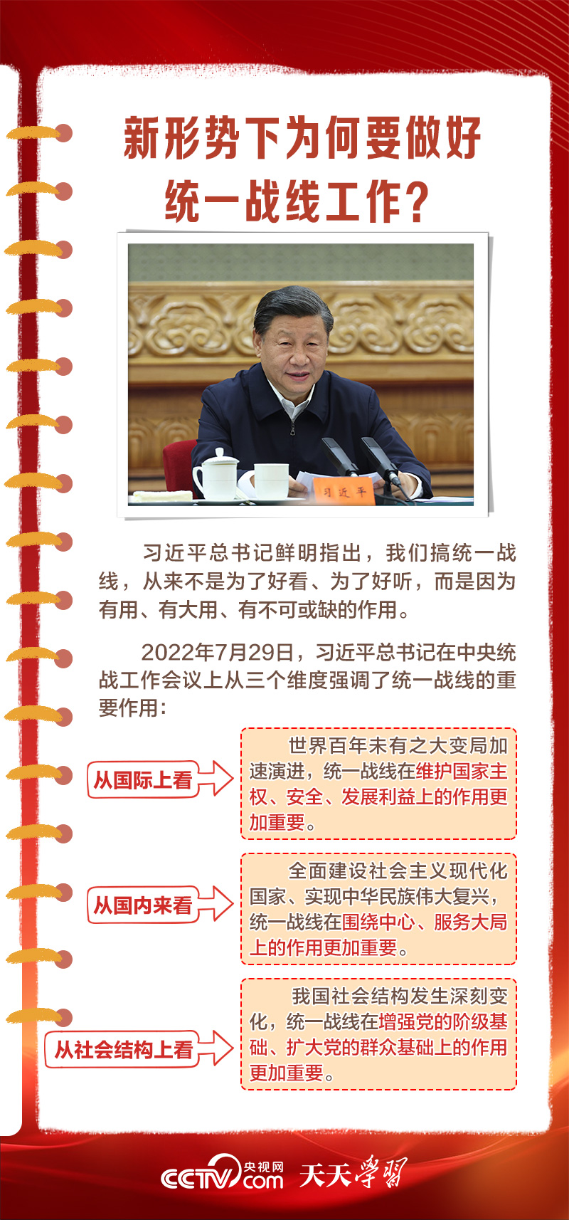 天天學(xué)習(xí)1月16日出版的第2期《求是》雜志發(fā)表了習(xí)近平總書記的重要文章《完整、準(zhǔn)確、全面貫徹落實(shí)關(guān)于做好新時(shí)代黨的統(tǒng)一戰(zhàn)線工作的重要思想》,該文是習(xí)近平總書記2022年7月在中央統(tǒng)戰(zhàn)工作會(huì)議上講話的一部分。文章指出,統(tǒng)一戰(zhàn)線是黨克敵制勝、執(zhí)政興國的重要法寶,是團(tuán)結(jié)海內(nèi)外全體中華兒女實(shí)現(xiàn)中華民族偉大復(fù)興的重要法寶,必須長期堅(jiān)持。