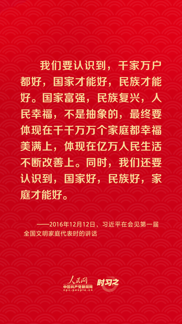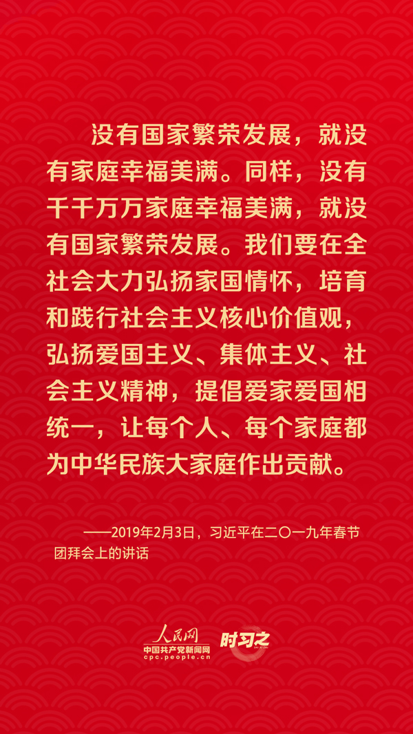 團(tuán)圓是春節(jié)永恒的主題?!皼](méi)有國(guó)家繁榮發(fā)展,就沒(méi)有家庭幸福美滿。同樣,沒(méi)有千千萬(wàn)萬(wàn)家庭幸福美滿,就沒(méi)有國(guó)家繁榮發(fā)展。”習(xí)近平總書記曾在多個(gè)場(chǎng)合深刻闡述家庭與國(guó)家之間的關(guān)系,從他的話語(yǔ)里一起感悟深厚的家國(guó)情懷。