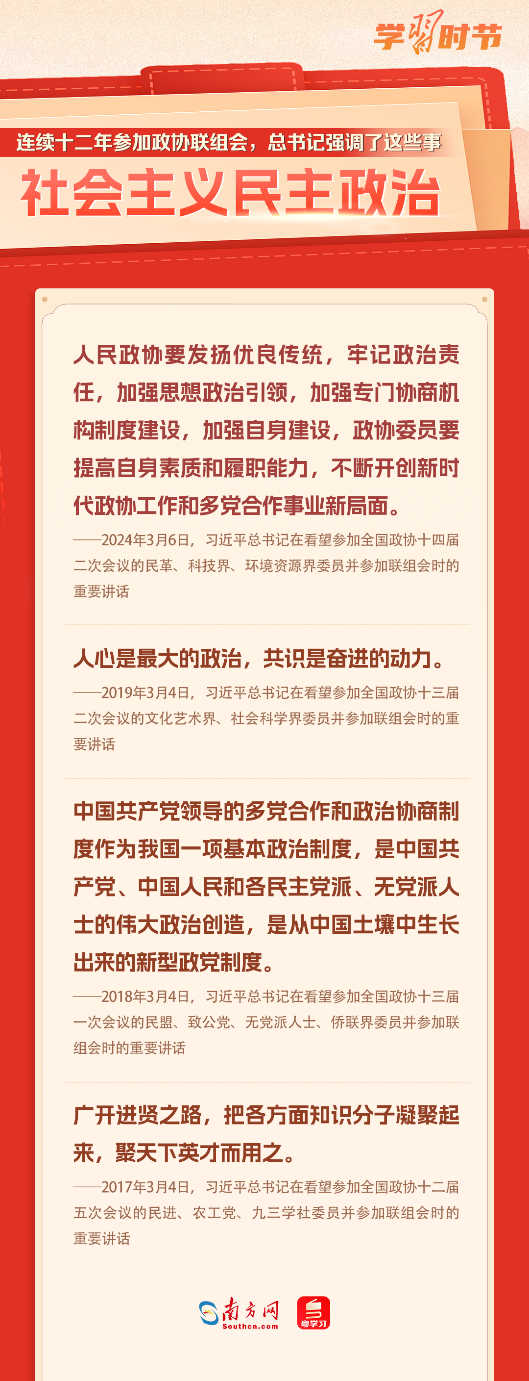 中國(guó)共產(chǎn)黨領(lǐng)導(dǎo)的多黨合作和政治協(xié)商制度是我國(guó)的一項(xiàng)基本政治制度。黨的十八大以來(lái),習(xí)近平總書(shū)記每年都參加政協(xié)聯(lián)組會(huì),對(duì)社會(huì)主義民主政治、民營(yíng)經(jīng)濟(jì)、自主創(chuàng)新、鄉(xiāng)村振興、社會(huì)保障、文化自信、國(guó)家統(tǒng)一等作出重要論述,讓我們一起重溫金句!