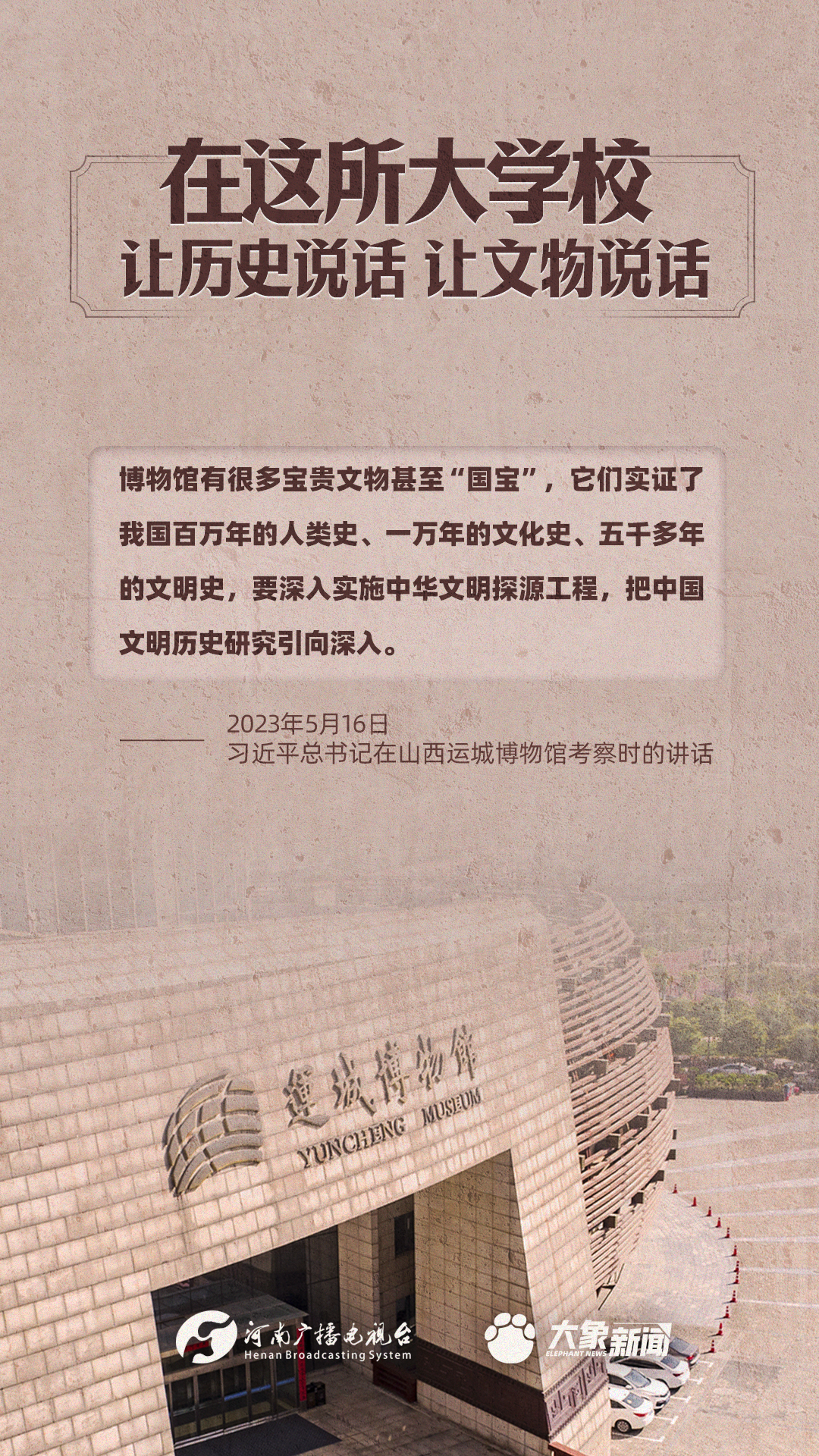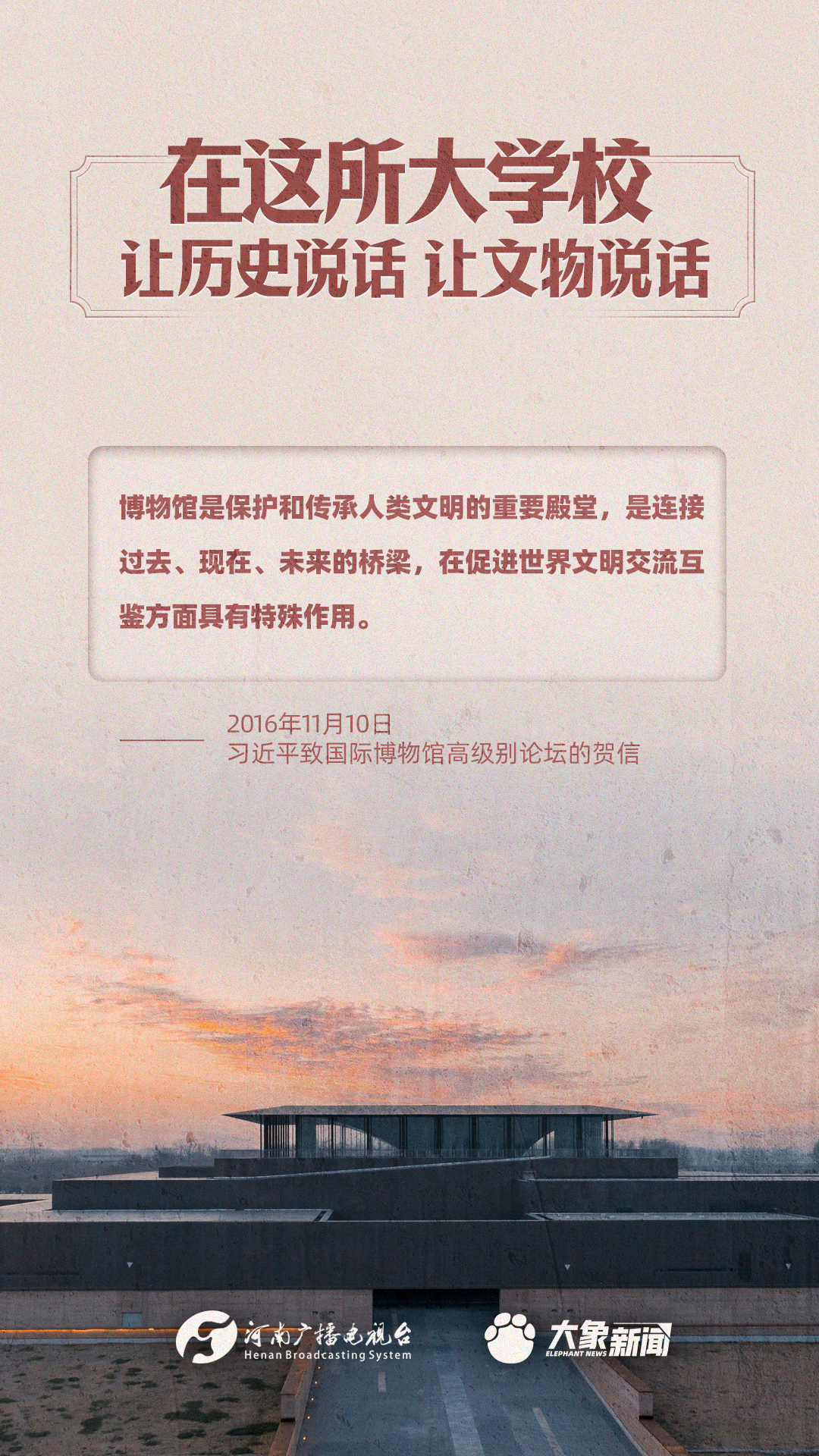 習(xí)近平總書記一直高度重視博物館工作,多次作出重要講話,強(qiáng)調(diào)“一個(gè)博物院就是一所大學(xué)校”,指出“讓歷史說話,讓文物說話”,要求“守護(hù)好、傳承好、展示好中華文明優(yōu)秀成果”等等,金句連連。大象新聞進(jìn)行了認(rèn)真梳理,邀您一起學(xué)習(xí)。