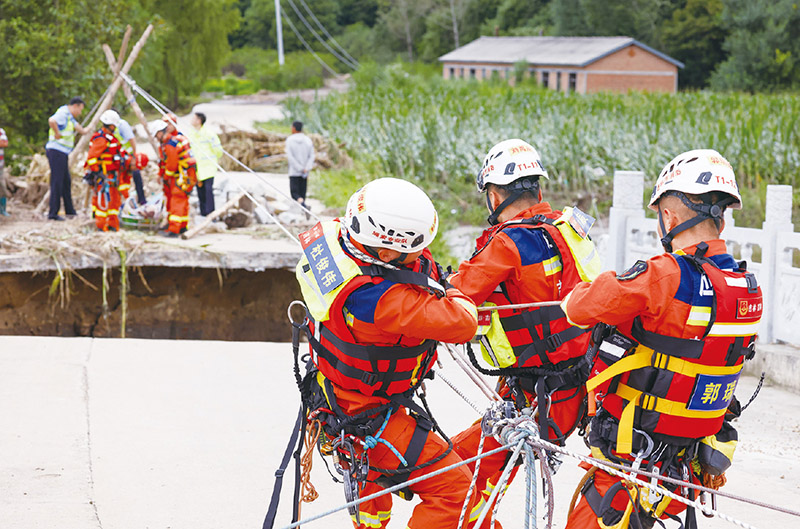 2023年夏,面對影響華北、黃淮、東北等地的嚴重汛情,在以習近平同志為核心的黨中央堅強領(lǐng)導下,廣大黨員干部為守護人民生命和財產(chǎn)安全挺身向前,千千萬萬人民群眾為保衛(wèi)家園頑強奮戰(zhàn)。圖為8月6日,吉林省吉林市消防救援支隊隊員利用繩橋解救受困村民。 新華社記者 顏麟蘊/攝