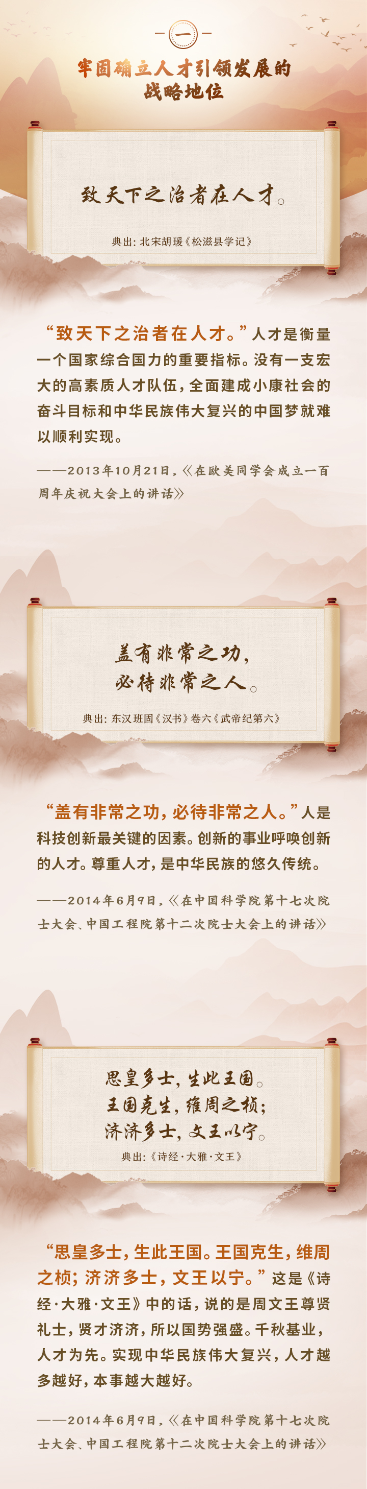 編者按:培養(yǎng)造就大批德才兼?zhèn)涞母咚刭|人才,是國家和民族長遠發(fā)展大計。黨的十八大以來,習近平總書記圍繞人才工作發(fā)表一系列重要論述,立意高遠,內涵豐富,思想深刻,深刻回答了為什么建設人才強國、什么是人才強國、怎樣建設人才強國的重大理論和實踐問題。在這些重要論述中,總書記精妙運用古代典籍、經典名句,以古喻今、啟迪思想、激蕩精神,讓我們一起來學習!
