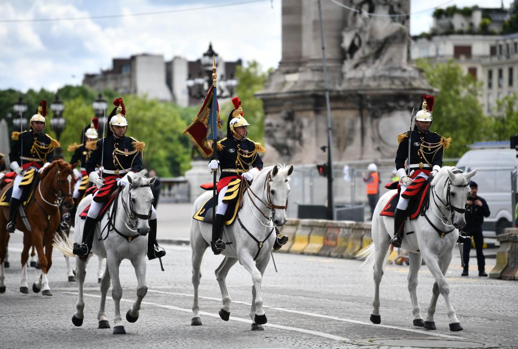 ??歡迎儀式后,習(xí)近平和夫人彭麗媛在共和國(guó)衛(wèi)隊(duì)148名騎兵組成的禮兵馬隊(duì)和摩托車(chē)隊(duì)護(hù)衛(wèi)下,乘車(chē)前往愛(ài)麗舍宮。