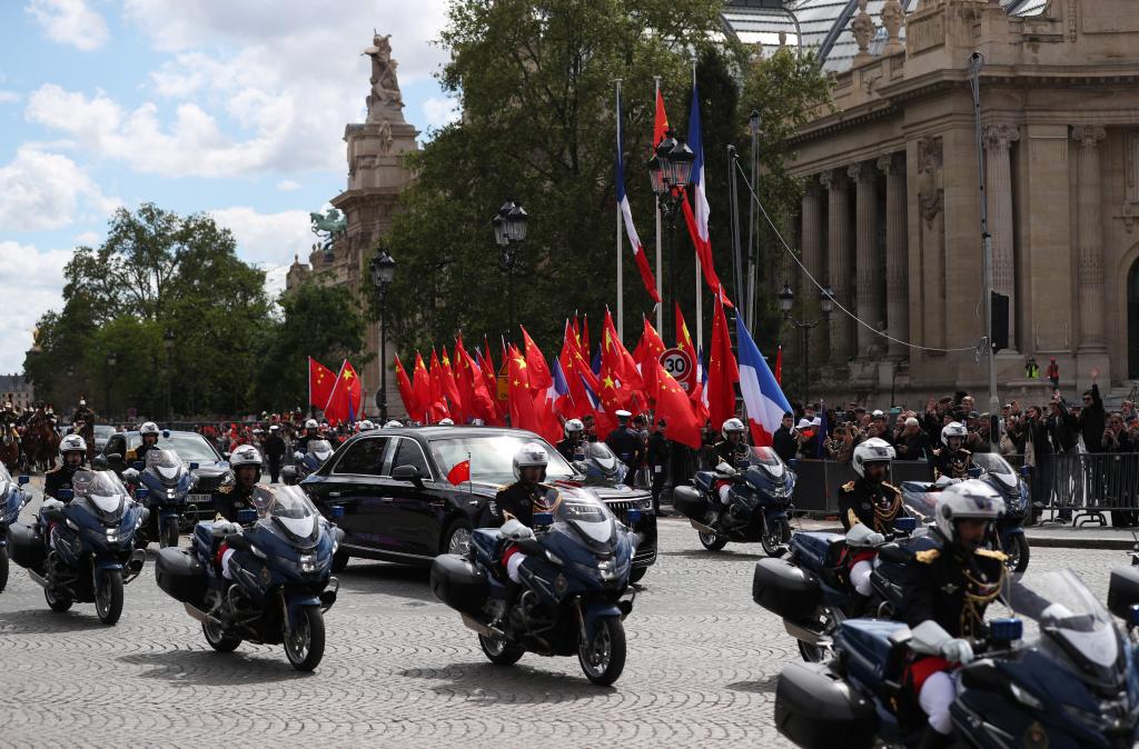 ??當(dāng)天下午,習(xí)近平在巴黎出席馬克龍舉行的隆重盛大歡迎儀式。兩國(guó)元首檢閱法蘭西共和國(guó)衛(wèi)隊(duì)和陸??杖妰x仗隊(duì),并觀看分列式。