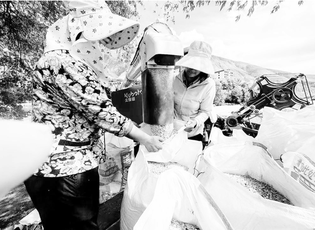 切割、脫粒、分離、卸糧……130多畝的麥田里,收割機帶著隆隆的轟鳴聲,在麥浪中來回忙碌,一顆顆飽滿的麥粒從收割機倉門傾瀉而下,源源不斷地被送上拖拉機?!霸谝郧埃粋€勞動力一天只能收割一畝地。收割130畝全家齊上陣加班加點需要十多天,現(xiàn)在使用機械作業(yè),7天就能收完,真的是太方便了?!笨粗馉N燦的麥子從收割機里噴涌而出,馬色村村黨支部書記土登臉上掩飾不住收獲的喜悅。他說,今年村里小麥和青稞長勢很好,村民已陸續(xù)開始收割。收割機的高效運轉(zhuǎn)、精準(zhǔn)作業(yè),極大地提高了效率,縮短了收割時間,讓夏收過程變得輕松快捷,給村民帶來了實實在在的便利。