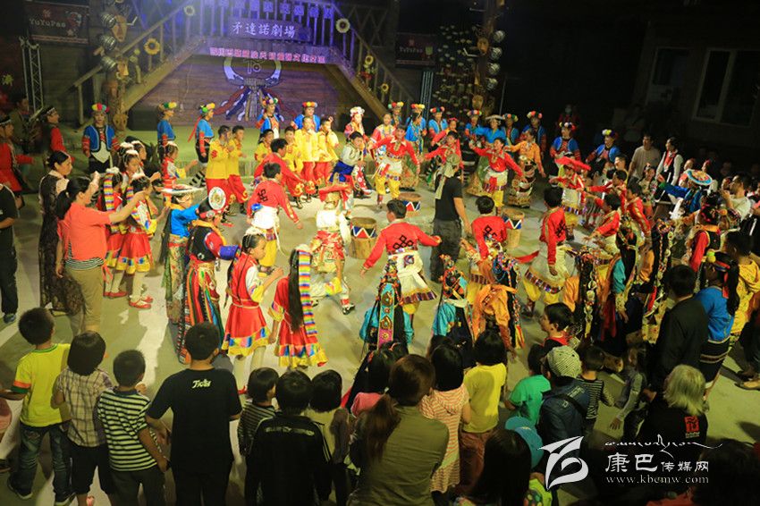 巴塘天籟童聲合唱團(tuán)與阿里山小學(xué)小朋友、當(dāng)?shù)厝罕?、外來游客同跳巴塘弦子?br />