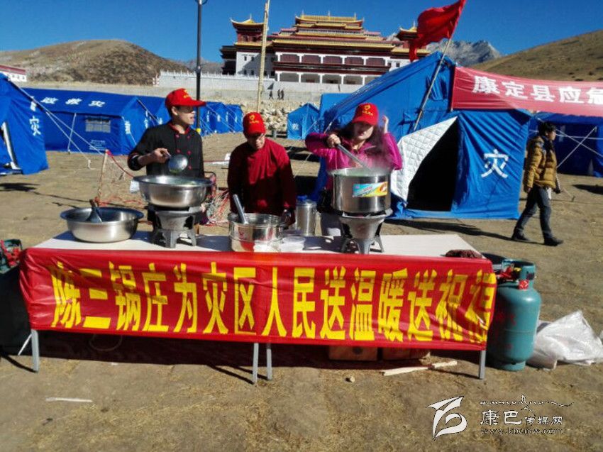 11月28日中午,記者來到康定塔公鎮(zhèn)祖慶小學(xué)采訪。在現(xiàn)場(chǎng),一群戴著紅帽子的人正在將熱氣騰騰的紅燒肉一勺一勺的分發(fā)到同學(xué)們碗中。仔細(xì)一看,現(xiàn)場(chǎng)還有一幅標(biāo)語,上面寫著“陳三鍋莊為災(zāi)區(qū)人民送溫暖送祝福”的字樣。記者揉了揉眼,確定沒看錯(cuò)。原來,陳三鍋莊是關(guān)了康定的門店,組織人員到災(zāi)區(qū)參與抗震救災(zāi)來了。