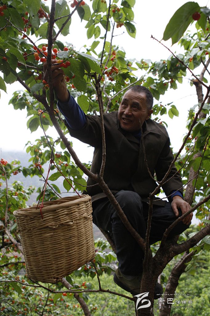 杵坭紅櫻桃產(chǎn)業(yè)的發(fā)展給當(dāng)?shù)卮迕駧?lái)了巨大的實(shí)惠。杵坭鄉(xiāng)杵坭村羊兒槽組村民田忠華家每年僅賣(mài)櫻桃就能收入近70000元。圖為田忠華正在自家櫻桃園采摘櫻桃。