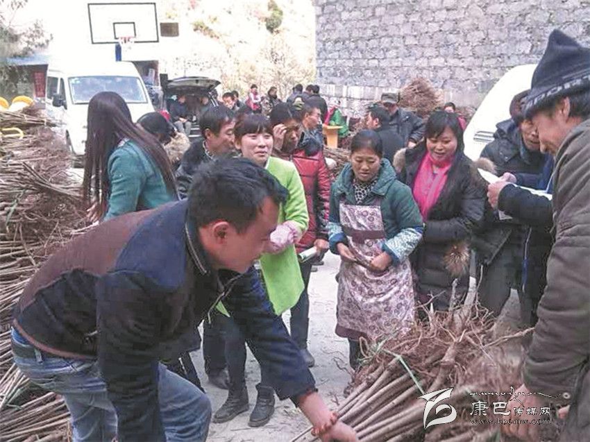 給村民分發(fā)果樹苗。