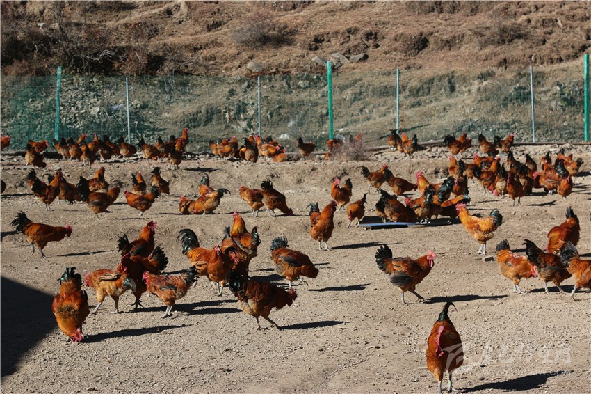雄雞啼鳴鬧山谷,灣地溝村喜脫貧。12月9日上午10時許,當記者沿著通村水泥路來到距雅江縣城20多公里的呷拉鎮(zhèn)灣地溝村紅標雞生態(tài)養(yǎng)殖基地時,只見冬日暖陽下的洼谷山半山坡上,成群結(jié)隊的大紅公雞正在樹林下或覓食或展翅或歡歌。飼養(yǎng)員告訴記者:“別小看這3000多只活潑可愛的跑山雞,那可是村民心中的‘財富金雞’!”