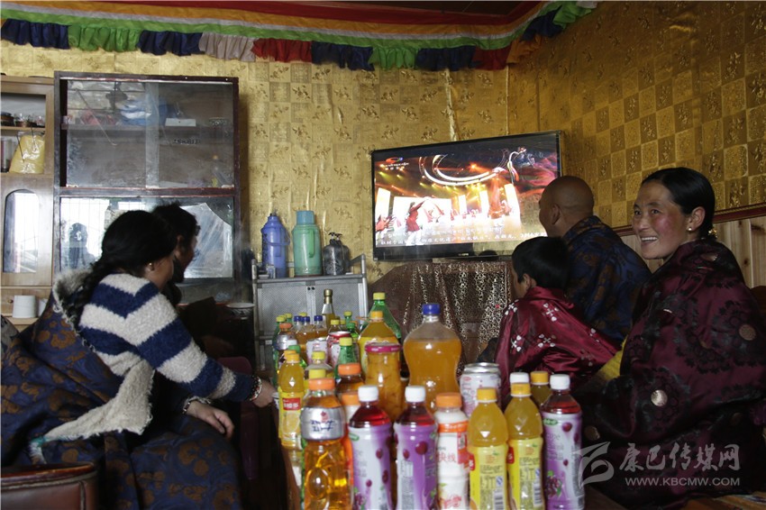 家里鋼爐中的火還在熊熊燃燒,滾燙的奶茶冒著陣陣香氣,藏桌上擺放的各種糖果、飲料和零食,顯現(xiàn)出這個牧民家庭已經(jīng)衣食無憂。50寸大彩電播放著精彩的文藝節(jié)目,讓這個家庭感受到了文藝帶給他們的快樂。眼前的一切,也讓記者在藏區(qū)牧民家中感受到了濃濃的年味。