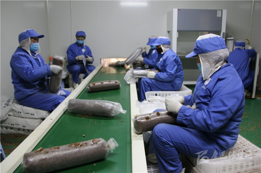 穿上防護服、經(jīng)過藥水消毒和空氣消毒后,記者進入菌種培育室,菌棒通過傳送帶源源不斷地傳輸,工人們眼明手快地在菌棒孔里種植菌種。