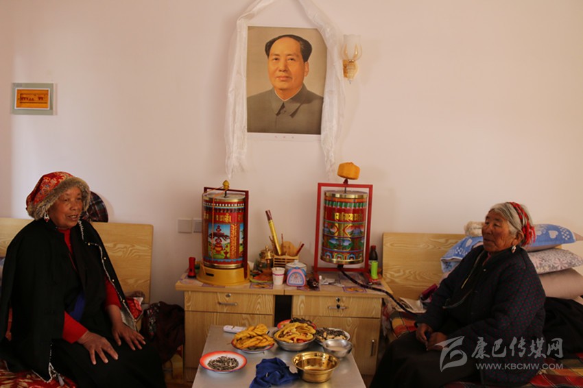 從餐廳出來,記者走進(jìn)了一間15平方米左右的宿舍。兩位老人正坐在各自的木床上看電視,墻上掛著的液晶電視是連著機(jī)頂盒的。兩床之間,放著藏桌和床頭柜,藏桌上有瓜子、花生、酥油果子、牛肉等食品,亞瑪翁青老人熱情地說:“因?yàn)檎谶^藏歷新年,這些都是福利院為我們備的年貨,你也嘗嘗!”。房間里最引人注目的便是掛在床頭柜上方的系著哈達(dá)的毛主席畫像,兩位老人指著毛主席畫像動(dòng)情地說:“毛主席、共產(chǎn)黨是我們的恩人,看著他的畫像我們安心?!贝送猓块g里還有衣柜、配有馬桶的獨(dú)立廁所和盥洗臺(tái),毛巾、漱口盅、掃把、拖把都整齊地放在對(duì)應(yīng)位置。亞瑪翁青笑著說:“我們住的房間都趕得上縣城里的賓館了?!?/span>