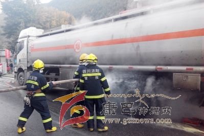 本網(wǎng)訊(夏俊林 文/圖)11月6日上午8點(diǎn)35分,康定縣南郊鬧市區(qū),一輛從稻城亞丁前往成都的油罐車后輪胎著火,沿街商戶行人驚恐逃避,及時(shí)趕來的消防員,5分鐘將火勢撲滅。