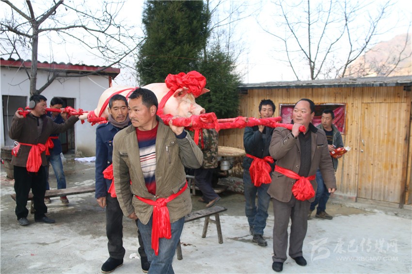 5個(gè)村民將年豬抬到秤上。360斤。村民為年豬準(zhǔn)備大紅花。準(zhǔn)備紙錢、香蠟。9點(diǎn)整,殺豬匠開始了他的工作,在眾人齊心協(xié)力下,光溜溜的年豬被打整干凈?!氨S游覀兇鍋砟觑L(fēng)調(diào)雨順、五谷豐登,村民平安健康?!贝逯欣险呔催^天地后,8個(gè)身強(qiáng)力壯的村民站在年豬旁,豎著拇指齊聲說,今年家家戶戶還要養(yǎng)大肥豬。抬著年豬,村里的中老年人簇?fù)碇?,走在最前面,唱著悅耳的民謠,大意是歌唱幸福生活的,迎著2018年的第一縷陽光,村民們喜氣洋洋。到村里來的游客蜂擁拍照。