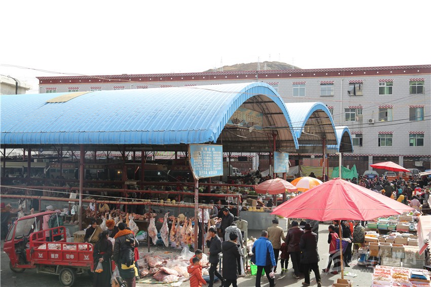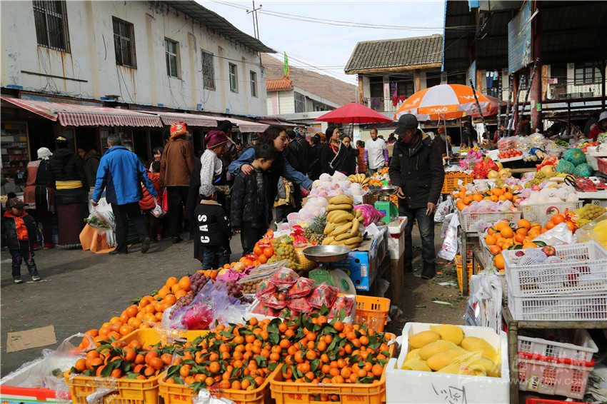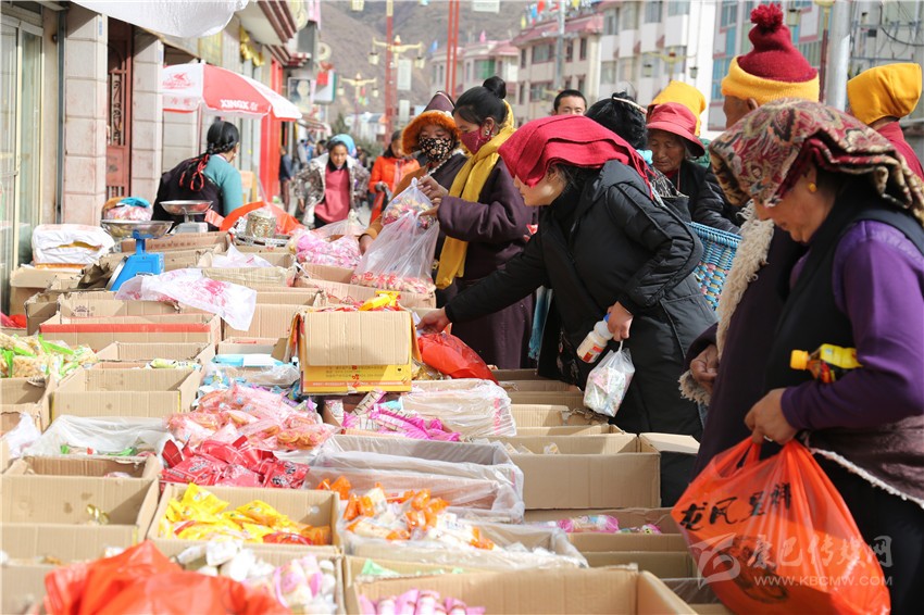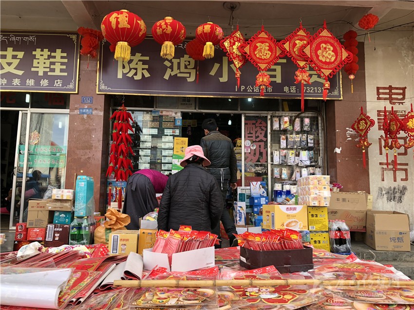 新都鎮(zhèn)格色村的丹真大哥和老伴兒其吉牽著8歲的孫子正在干果店里挑選各類干果,身后的背簍里水果、蔬菜、酥油、牛肉等農(nóng)畜產(chǎn)品以及中國結(jié)、年畫、對聯(lián)、掛圖等吉祥的節(jié)日物品應(yīng)有盡有。