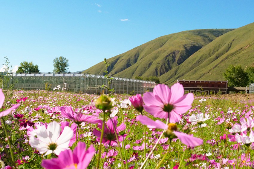 當(dāng)車輛飛馳在G305沿線,遠(yuǎn)處顏色鮮艷的圓柱形建筑十分吸引眼球,推開(kāi)絳紅色的木質(zhì)大門(mén)那一刻,就像是開(kāi)啟了一座寶藏之門(mén),經(jīng)過(guò)半圓的坡道,來(lái)到了位于道孚縣鮮水鎮(zhèn)孜龍村的甘孜州康巴植物園。