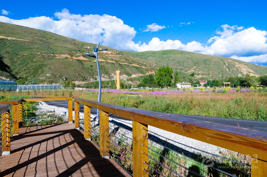 陽(yáng)光下,成片開(kāi)放的波斯菊搖曳生姿,成片白楊林包圍著12個(gè)16—25平方米不等的仿道孚民居外觀的樹(shù)屋,沿著鵝卵石鋪設(shè)、牡丹點(diǎn)綴的棧道漫步,兩側(cè)種植著落葉松、金葉垂榆、康定木蘭、五小葉槭等32種具有高原特色的植物,樹(shù)下種植以虞美人、百葉菊等17種花卉為主的草本植物;來(lái)到湖心島,不少人坐在其間休閑,有的坐在樹(shù)下乘涼,有的坐在溪邊聊天,還有不少人在伸臂橋上照相,不遠(yuǎn)處透明的玻璃溫室展覽館已經(jīng)完成建設(shè),走過(guò)開(kāi)滿桃花的拱形門(mén),陽(yáng)光灑在地面上讓人心生暖意,廢棄的水塔變成了打酥油茶用的醬桶,山、水、溪、樹(shù)、花、屋構(gòu)成了不同意境的高原園林景觀。