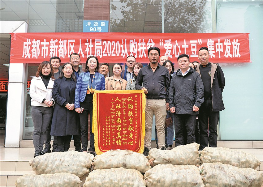 “感謝你們幫助認(rèn)購(gòu)3萬(wàn)余斤土豆……扎西德勒!”11月6日上午8點(diǎn)36分,“愛心土豆”車隊(duì)剛在新都區(qū)人社局停車場(chǎng)停穩(wěn),降央吉村一個(gè)躍步下車,為等候多時(shí)的人社局送上“認(rèn)購(gòu)扶貧獻(xiàn)愛心、人社濟(jì)困寫真情”的錦旗。