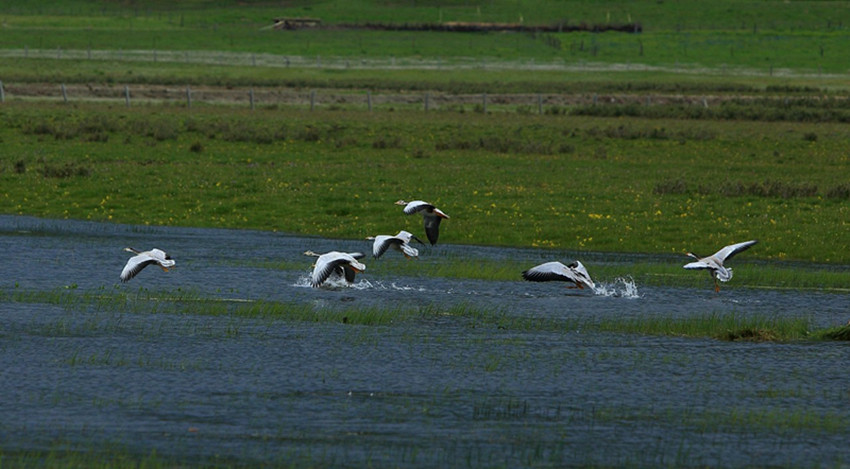 斑頭雁在白玉縣藍松湖上“飛舞”。 風語 攝