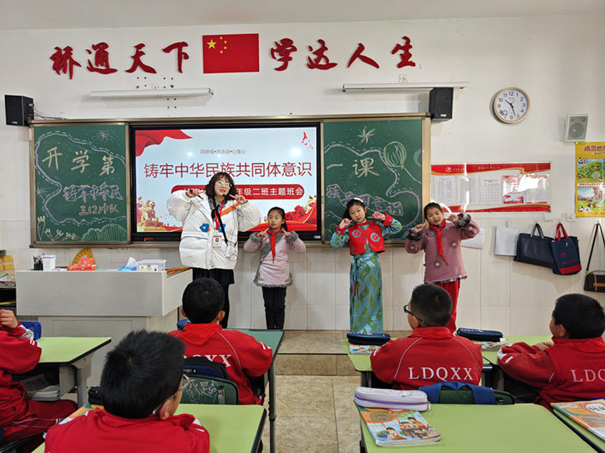 “同學(xué)們,新學(xué)期新起點(diǎn),沐浴著紅城綠谷春的氣息,我們定要同努力、共奮進(jìn),健康成長,揚(yáng)眉‘兔’氣!”典禮一結(jié)束,學(xué)生回到教室后,各班班主任便結(jié)合班級情況,開展以“鑄牢中華民族共同體意識”為主題的“開學(xué)第一課”班會活動。