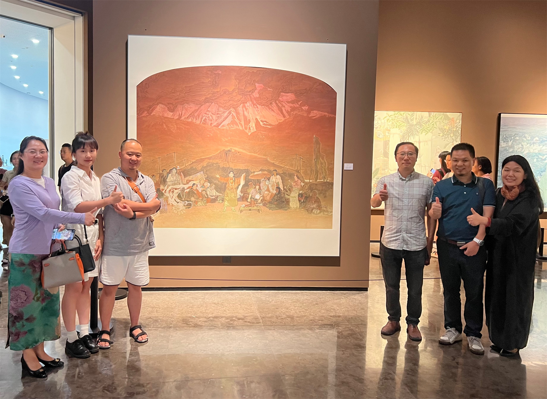 “這幅畫運用了唐卡的技法和審美,首先,是色彩吸收了古代壁畫的配色;其次,人物造型在寫實基礎(chǔ)上增加了唐卡中的平面造型審美;再者,將傳統(tǒng)唐卡畫中的顏料、畫布和染法,與歷史題材的中國畫創(chuàng)作融合統(tǒng)一起來。這種淳樸、自然的和諧融合是我這十多年來一直探索的個人藝術(shù)風(fēng)格?!眲⒅铱〗榻B說,這幅畫中遠景、中景、近景契合了天、地、人的喻義,人群、帳篷與大地構(gòu)筑了和諧相生的理想狀態(tài),展現(xiàn)出了民族民間文化的歷史縱深感和文化厚重感。