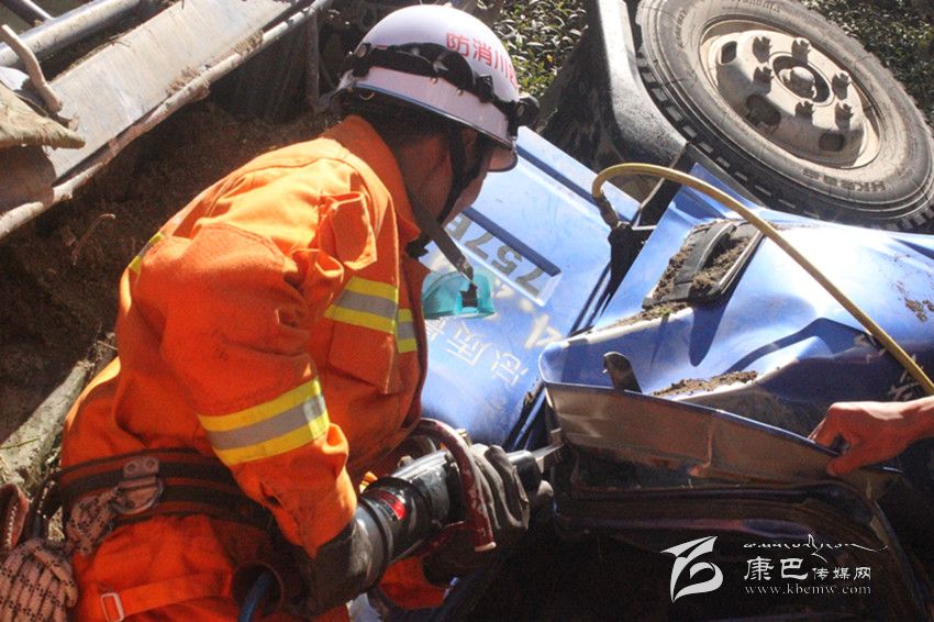 接警后,支隊指揮中心賡即調(diào)集1臺搶險救援車和8名消防官兵火速趕往事發(fā)現(xiàn)場,實施救援。10時43分左右,消防官兵抵達事發(fā)現(xiàn)場。經(jīng)現(xiàn)場調(diào)查,了解側(cè)翻卡車是因剎車失靈發(fā)生事故,車頭被嚴重擠壓變形,駕駛室中有一名被困人員被卡住無法動彈?,F(xiàn)場情況十分緊急,指揮員立即組織安全員對事故現(xiàn)場安置警戒帶、警戒標識;破拆小組利用液壓擴張剪斷器等救援器械對車內(nèi)被困人員實施破拆救援。20分鐘后,在消防官兵的努力下,受困人員被成功救出。