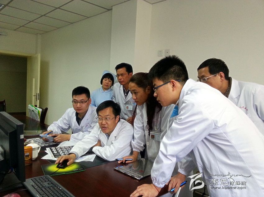 ●梁宗安教授(中)在內(nèi)一科開展臨床教學(xué)指導(dǎo)。